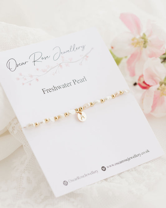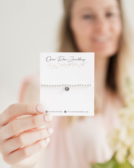 Silver Hand Stamped Initial Stretch Beaded Bracelet