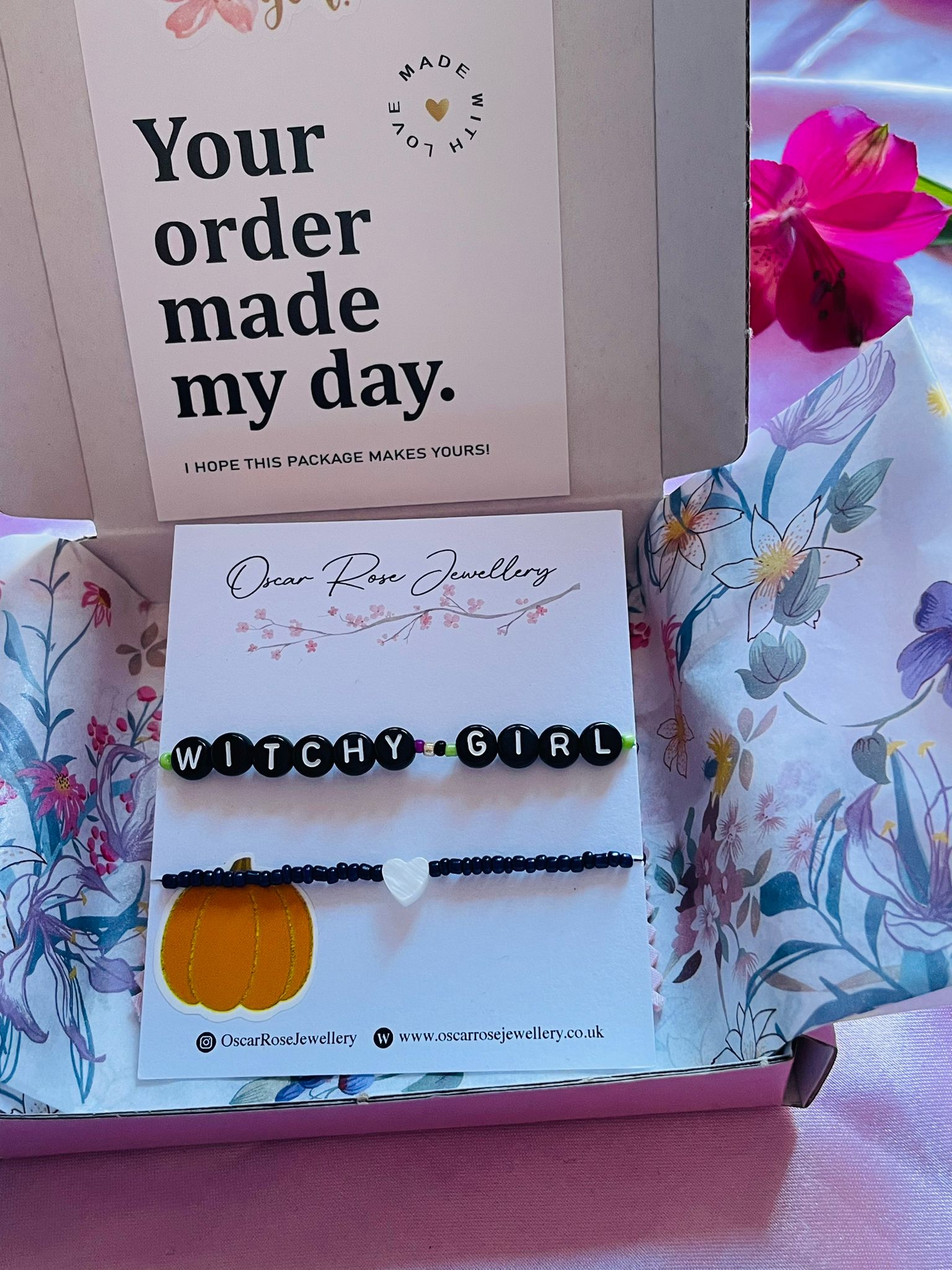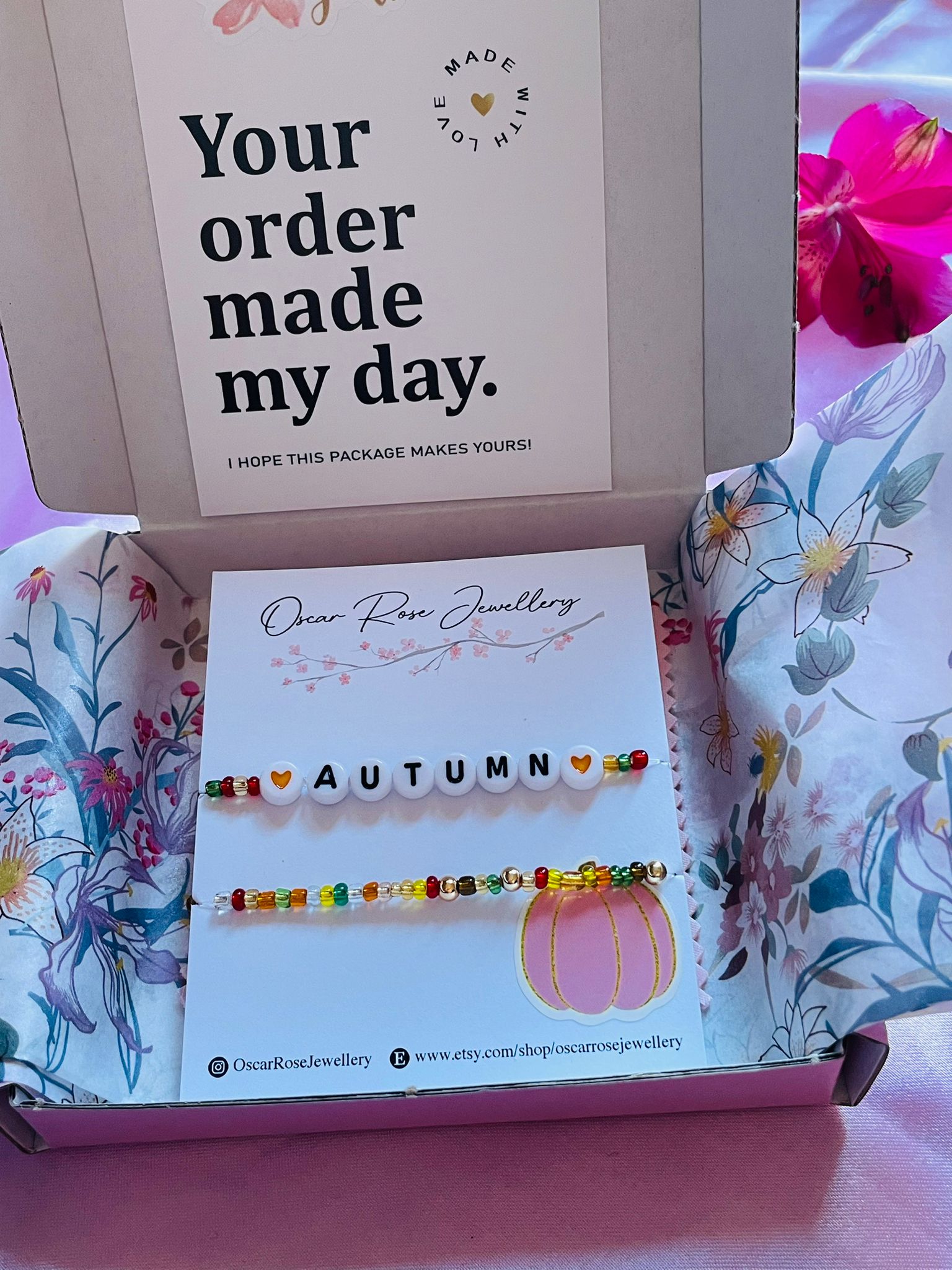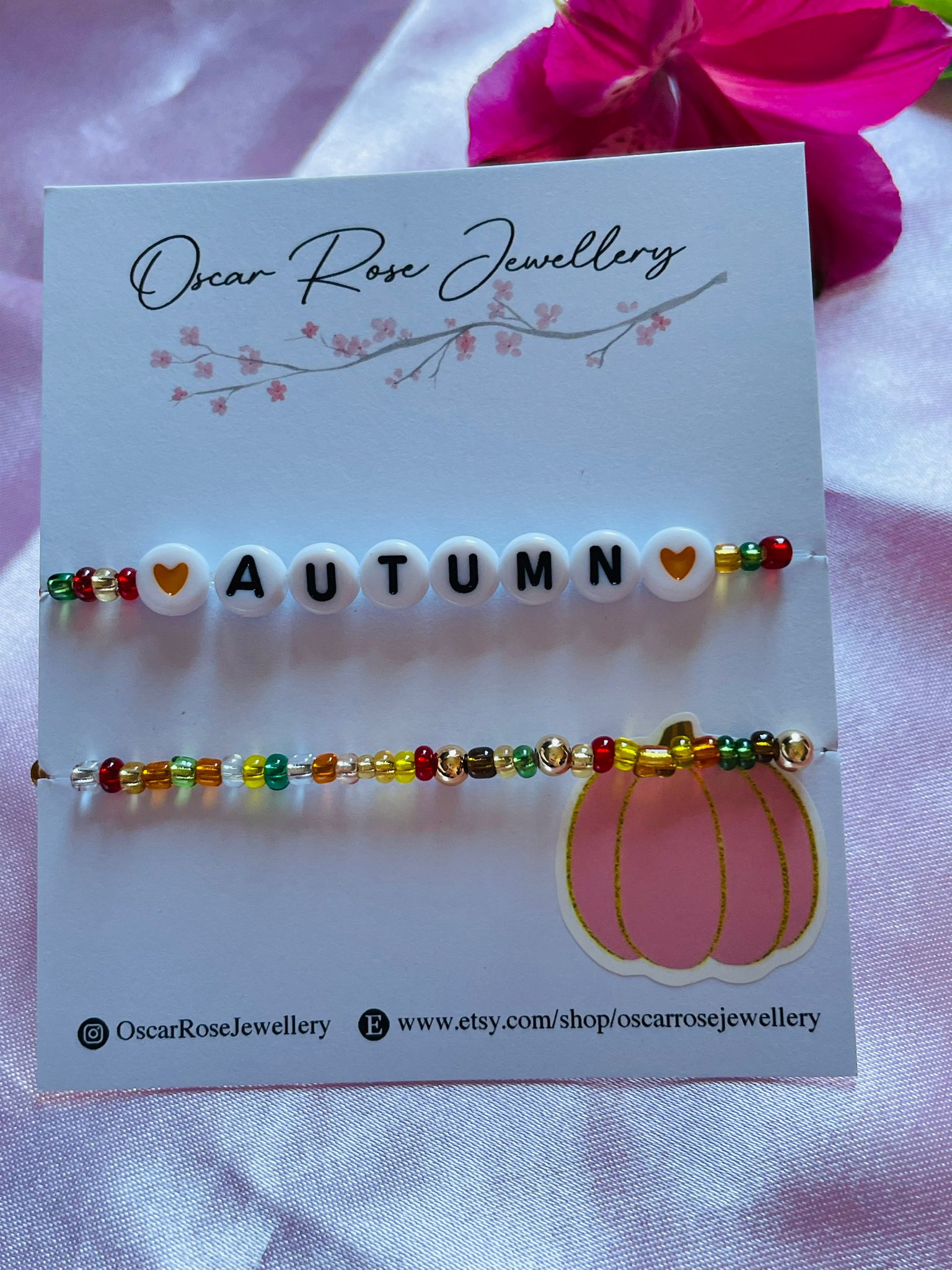 Celebrate the beauty of Autumn with these handmade seed bead bracelets in warm, earthy autumn colours. Each bracelet features cosy autumn inspired words like Autumn, Autumn Vibes, Pumpkin Spice, Witchy Girl. Perfect for layering or wearing solo, these bracelets bring a touch of autumn charm to your everyday style.