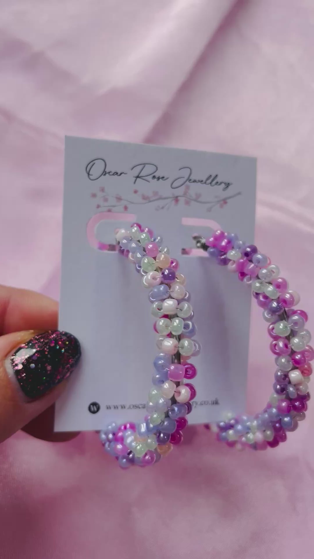 Add a pop of colour to your outfit with these playful, handmade seed bead hoop earrings! Each pair is carefully crafted with a mix of pastel and bright glass beads in pAstro shades of pink, blue, green, and white. Lightweight and fun, these hoops bring a touch of joy and nostalgia to any look — perfect for spring, festivals, or everyday wear.