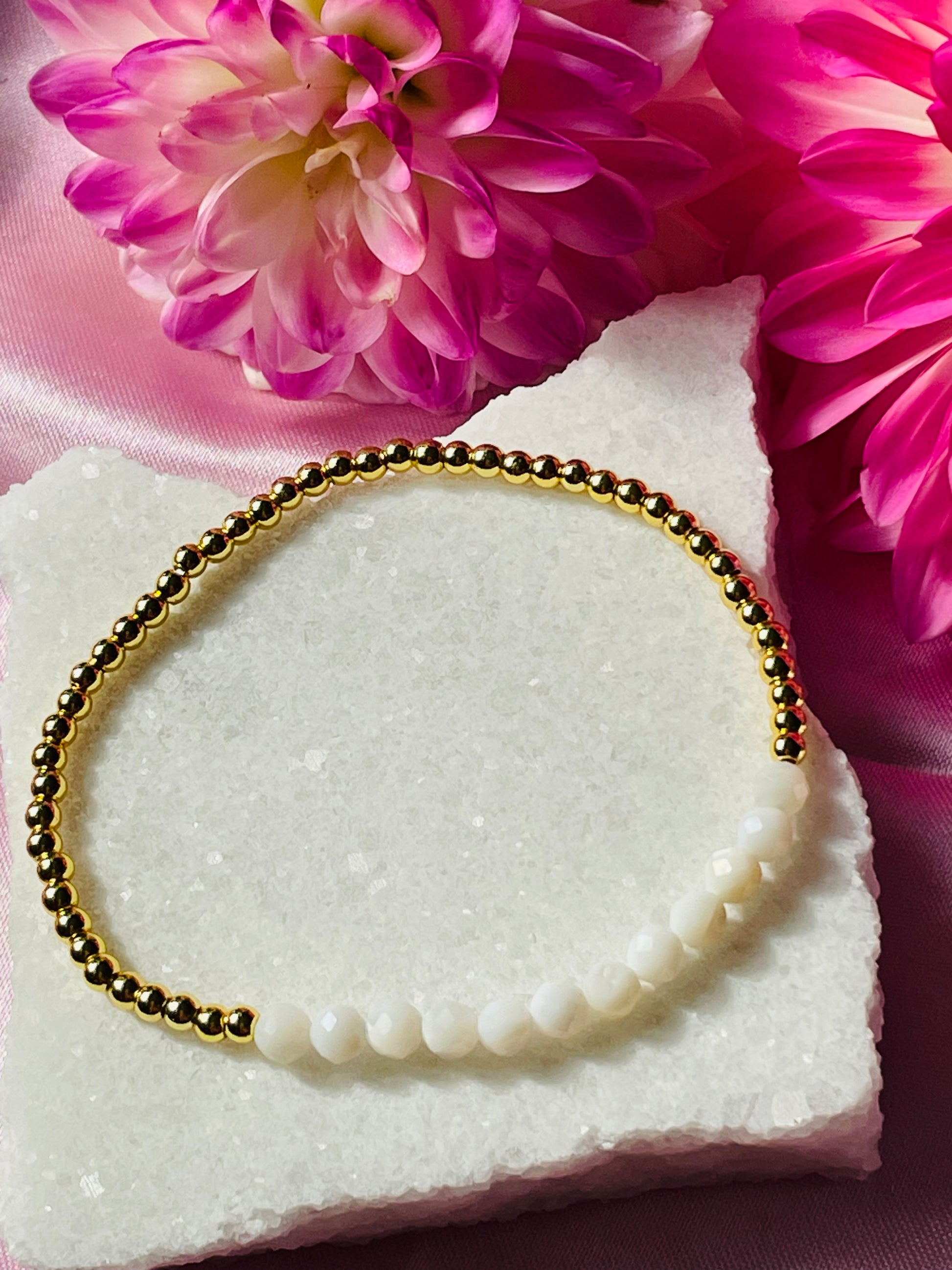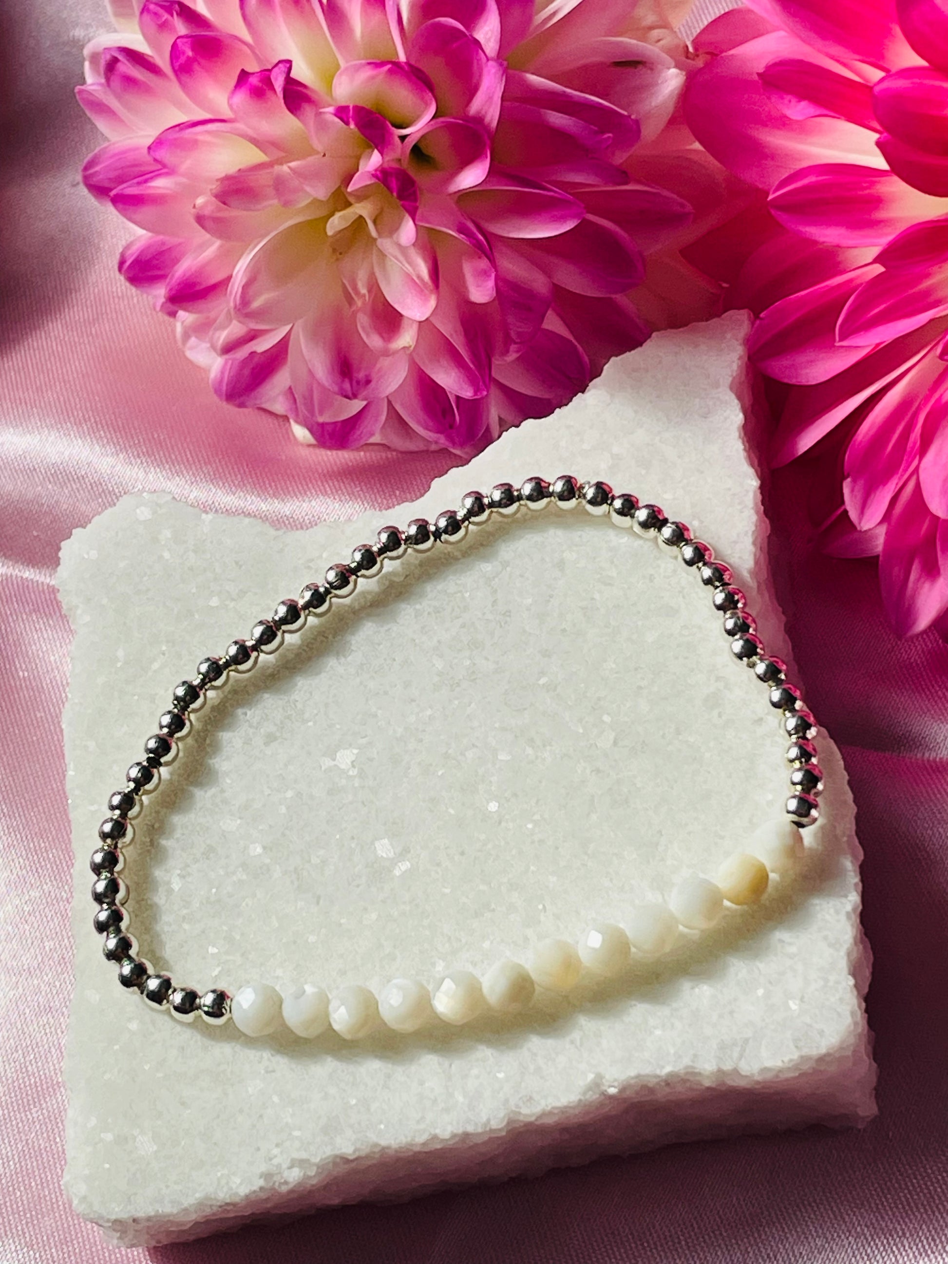 This stunning handmade beaded bracelet with 4mm Mother of Pearl beads and 4mm silver plated beads.