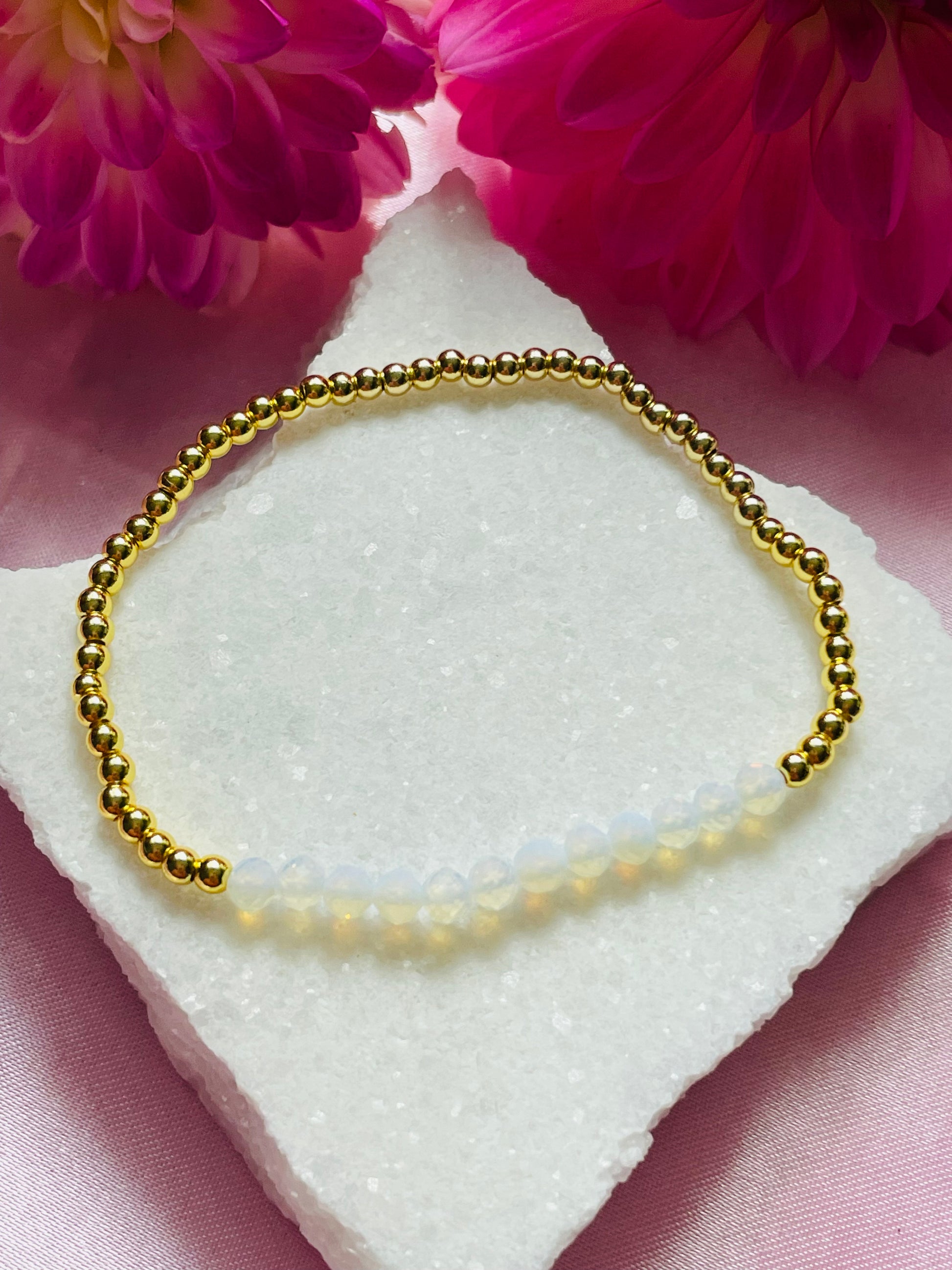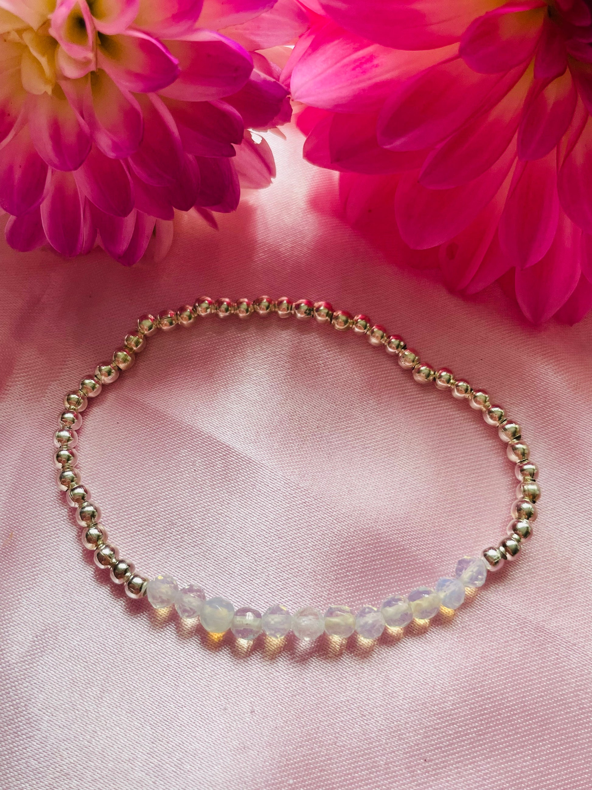 Made using 3mm silver/gold plated beads & 4mm faceted Opal beads strung onto jewellers elastic.
